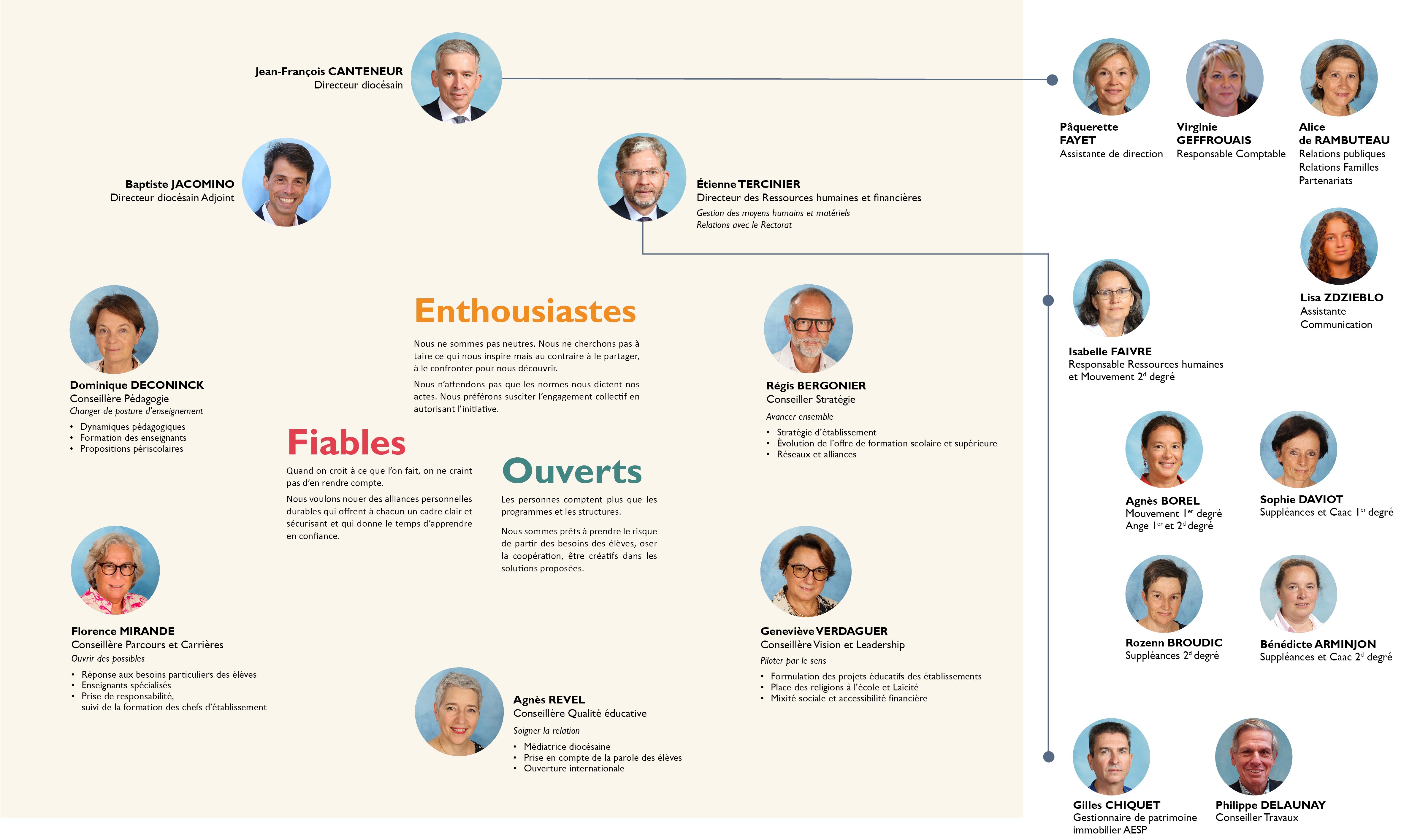 L’organisation de la Direction diocésaine, ci-dessous, exprime les attitudes qu’elle valorise et ses priorités stratégiques partagées avec les établissements scolaires catholiques à Paris.